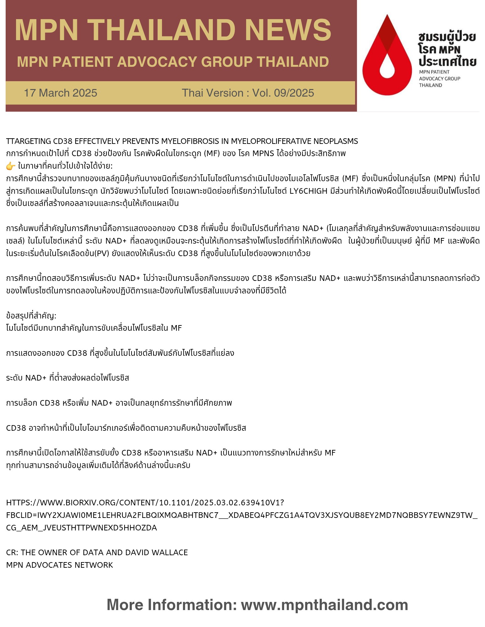 การกำหนดเป้าหมายไปที่ CD38 ช่วยป้องกัน โรคพังผืดในไขกระดูก (MF) ของ โรค MPNs ได้อย่างมีประสิทธิภาพ