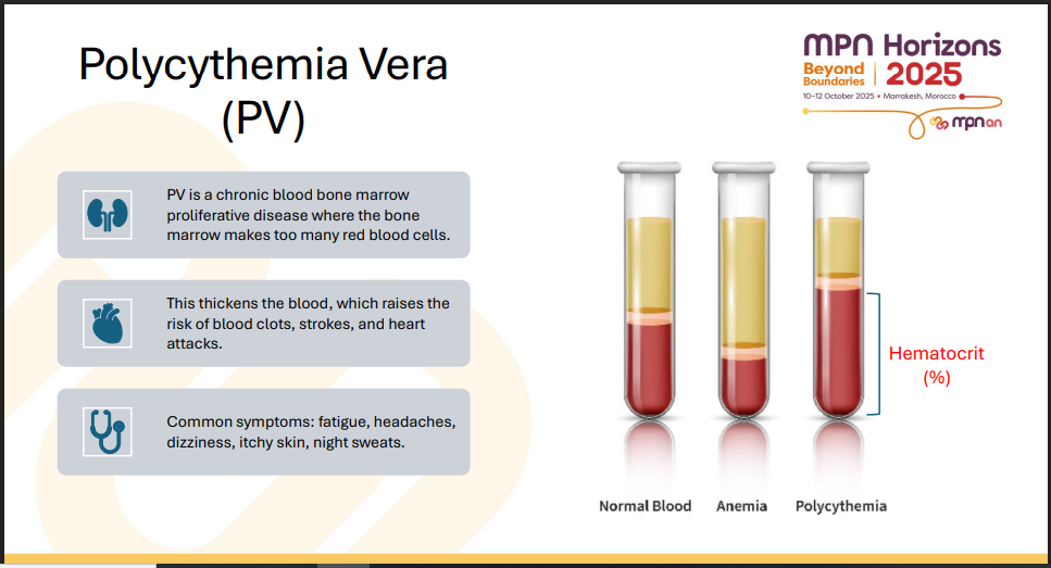 PV คือโรคความผิดปกติของไขกระดูกเรื้อรัง ที่ทำให้ร่างกายสร้างเม็ดเลือดแดงมากเกินไป เลือดจึงข้นหนืดขึ้น และเพิ่มความเสี่ยง ลิ่มเลือด อุดตัน เส้นเลือดสมอง และหัวใจขาดเลือด